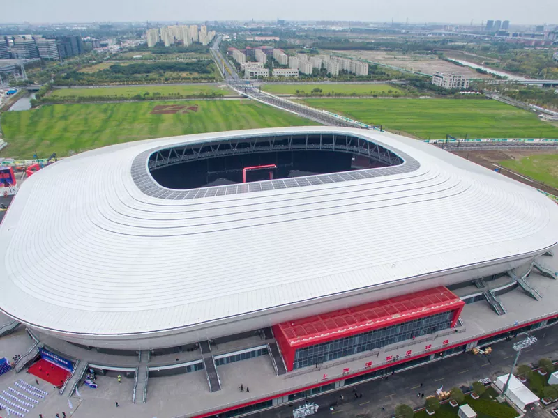 Toppen er normalt dækket med lette metalplader eller gennemskinnelige membranmaterialer, som ikke kun sikrer strukturen af ​​strukturen, men også tager højde for kravene til æstetik og belysning. Gennem teknologier som gitterstrukturer og fagstole opnår det en stor-span søjlefri rumdesign, der giver mulighed for fleksibelt layout inde i lokalet og giver en åben og uhindret udsigt for publikum.